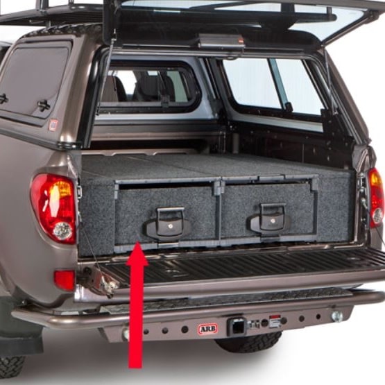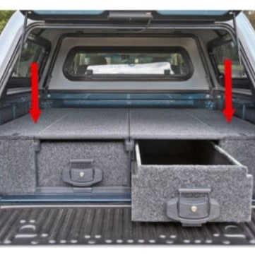un tiroir avec couvercle sur glissière : ce tiroir donne un grand espace de stockage et la possibilité de monter un réfrigérateur sur son couvercle, qui pourra être tiré dans et hors du votre véhicule. Contrairement aux autres produits de ce type c’est le seul à avoir une surface complètement plate qui fait que la surface de chargement est optimale si vous n’utilisez pas de réfrigérateur. Dimensions : 1355 x 505 x 310 mm