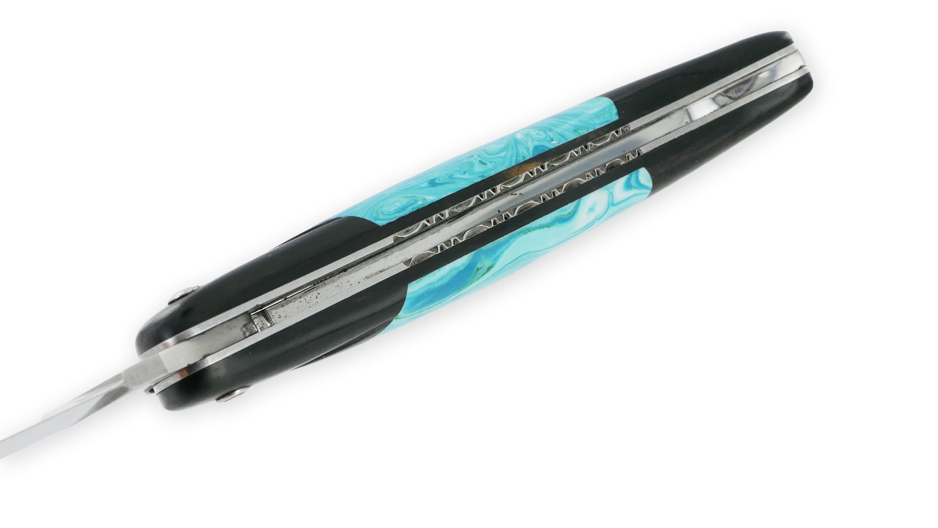 Pierre rare et naturelle, le larimar est reconnu pour ses nuances bleues et ses volutes blanches rappelant la mer et le ciel. Chaque fragment est unique, donnant à chaque couteau une identité singulière et lumineuse.