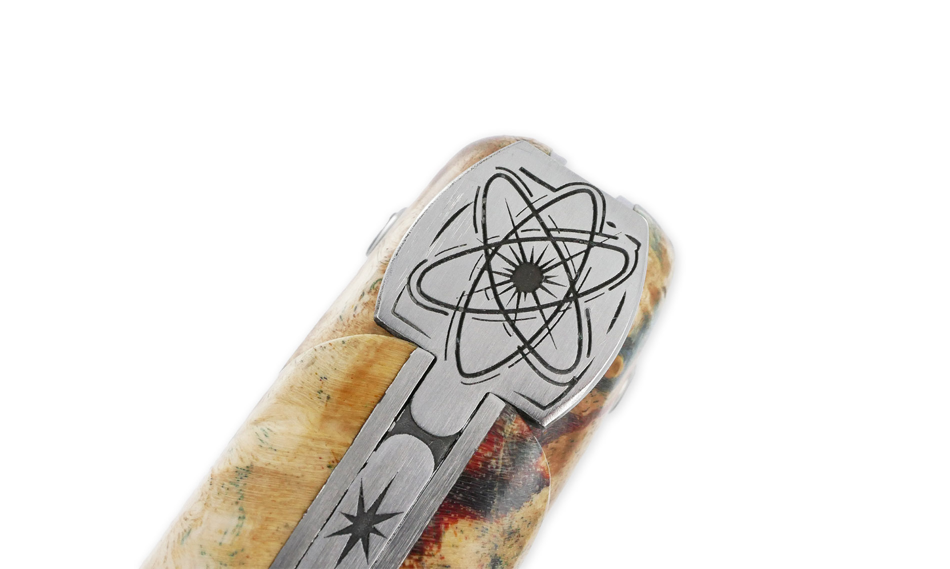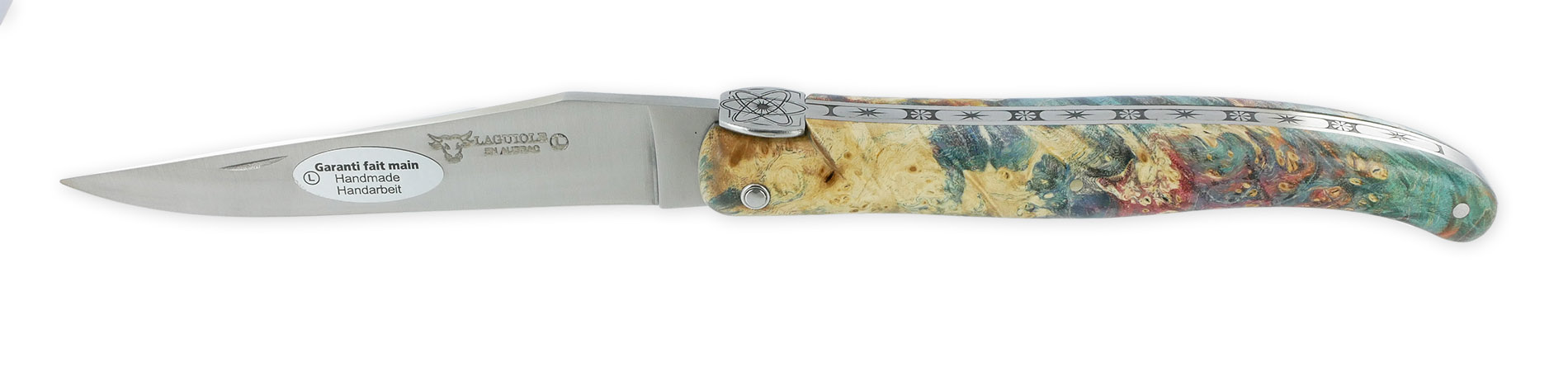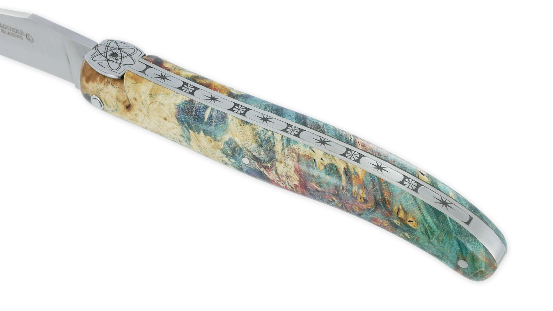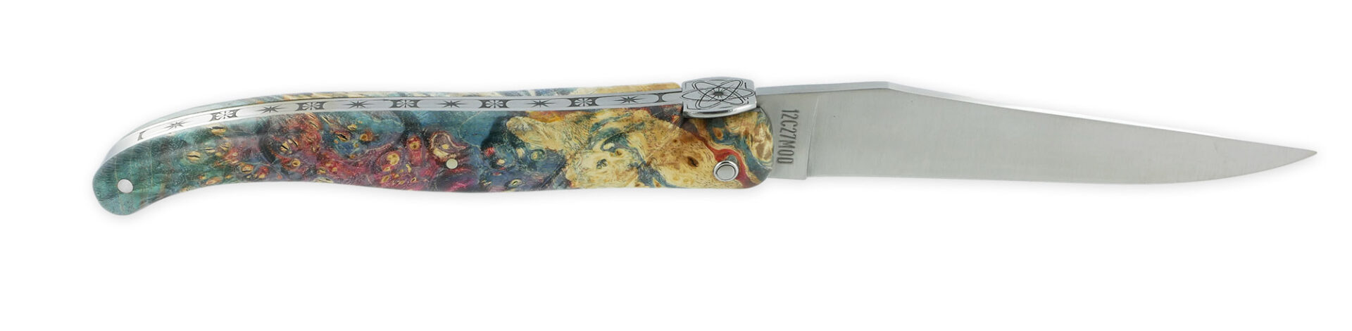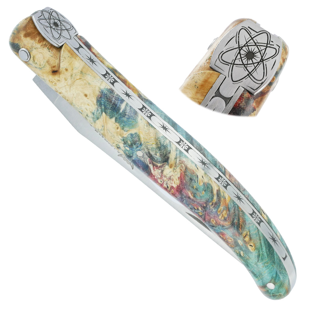 Chaque couteau de la collection COSMOS est doté d’un manche en loupe de sureau teintée, un bois précieux aux motifs naturels fascinants. Ses couleurs profondes et vibrantes rappellent les tourbillons lumineux de la Voie lactée, capturant l’éclat des étoiles dans une composition à la fois poétique et singulière.