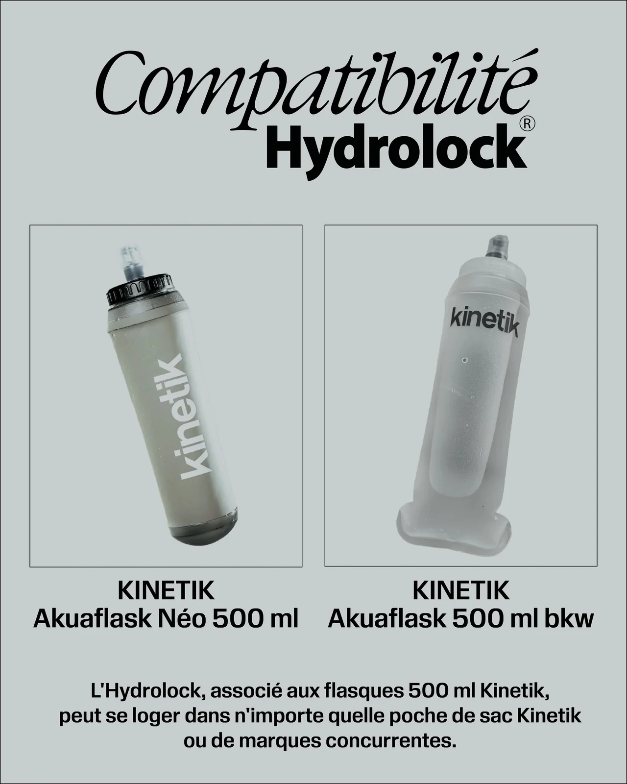 Compatibilité : L’Hydrolock est compatible uniquement avec deux modèles de flasques Kinetik : la 500 ml Néo et l’AKUAFLASK 500 ml BKW. Cependant, L’Hydrolock, associé aux flasques 500 ml Kinetik, peut se loger dans n’importe quelle poche de sac Kinetik ou de marques concurrentes.