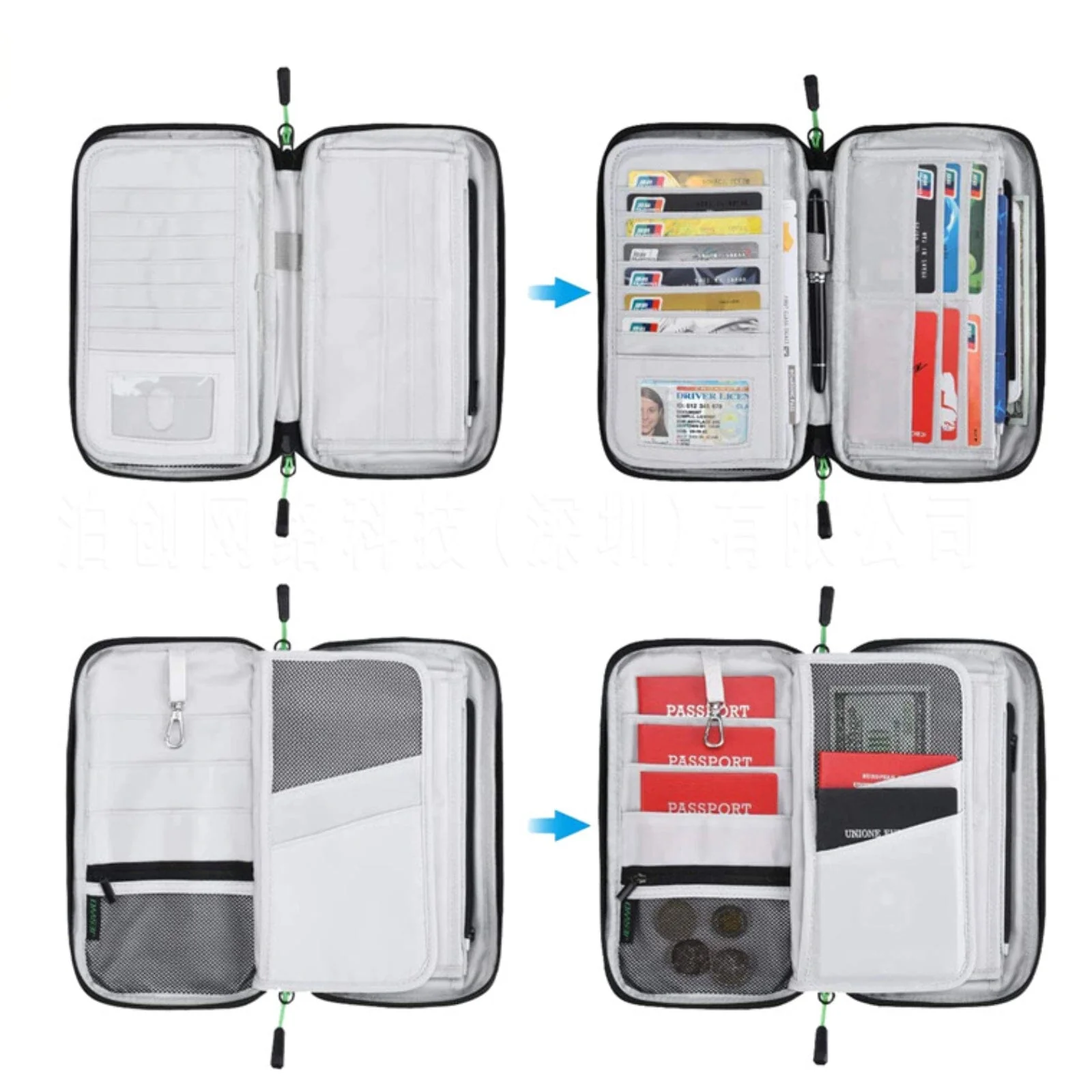 - Nombreux compartiments pour passeports, cartes, billets, etc.