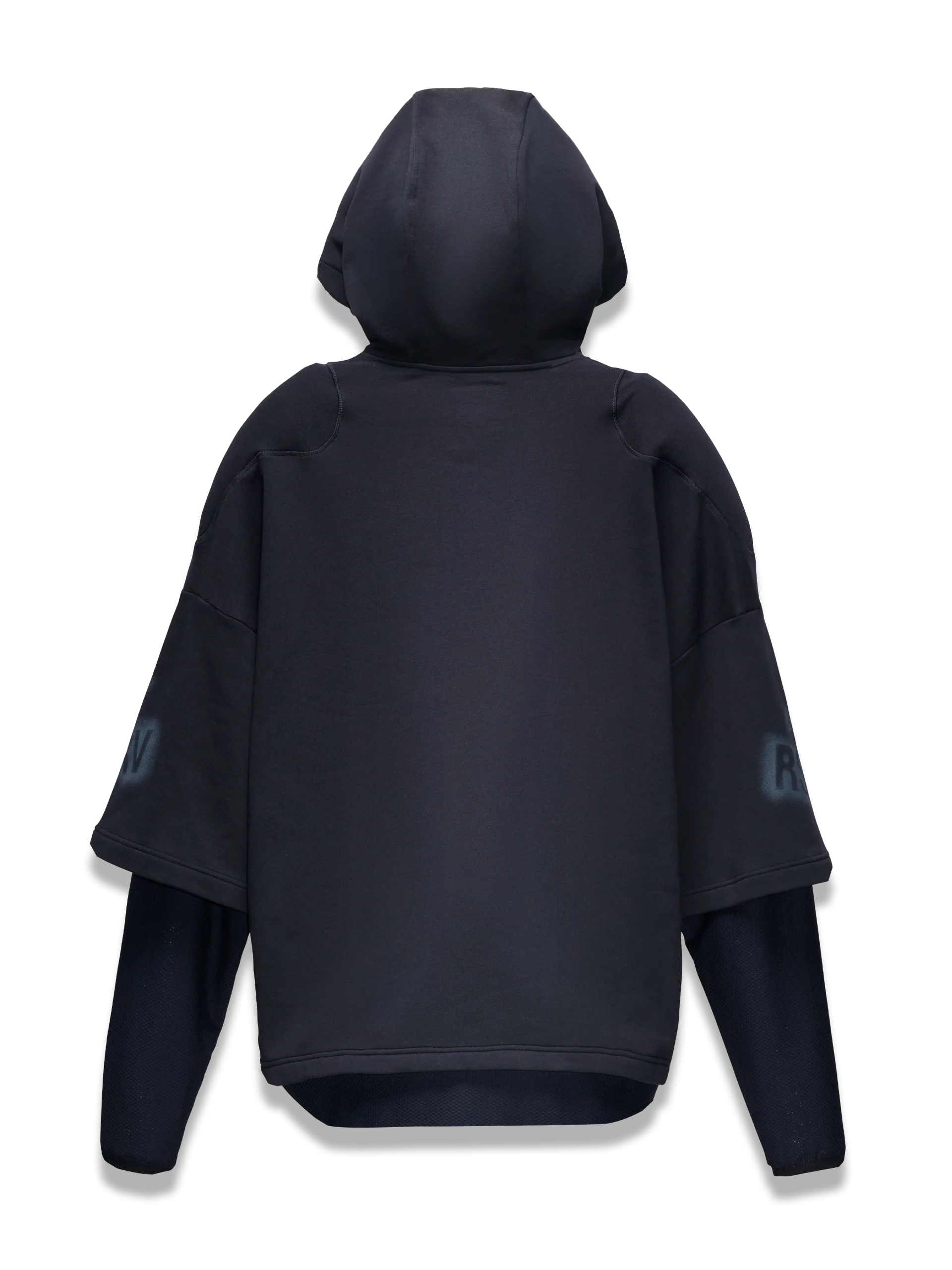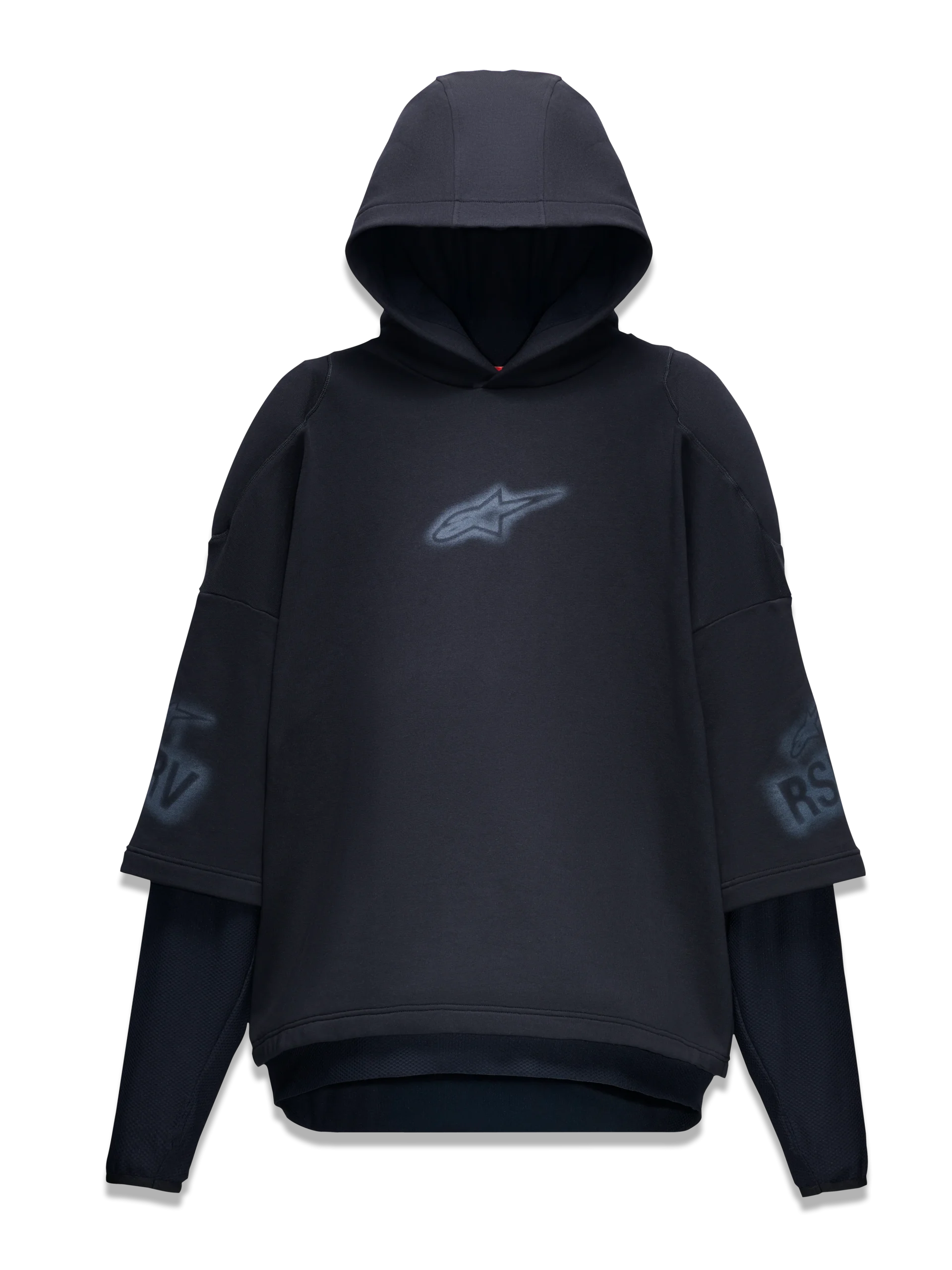 Le DISCHARGED HOODIE est un vêtement d’extérieur exagéré avec une capuche surdimensionnée, des manches superposées et une coupe hyper-décontractée. Il se présente comme 2 pièces, avec des manches surdimensionnées mi-longues révélant des manches en maille plus ajustées avec des ouvertures pour les pouces en dessous. Il enveloppe le porteur avec son matériau en coton lourd et les inserts d’épaule en armure douce créent du volume et de la largeur. Les logos Astar et RSRV sont imprimés en sérigraphie sur la poitrine et les manches dans un effet pochoir tonal et pulvérisé.