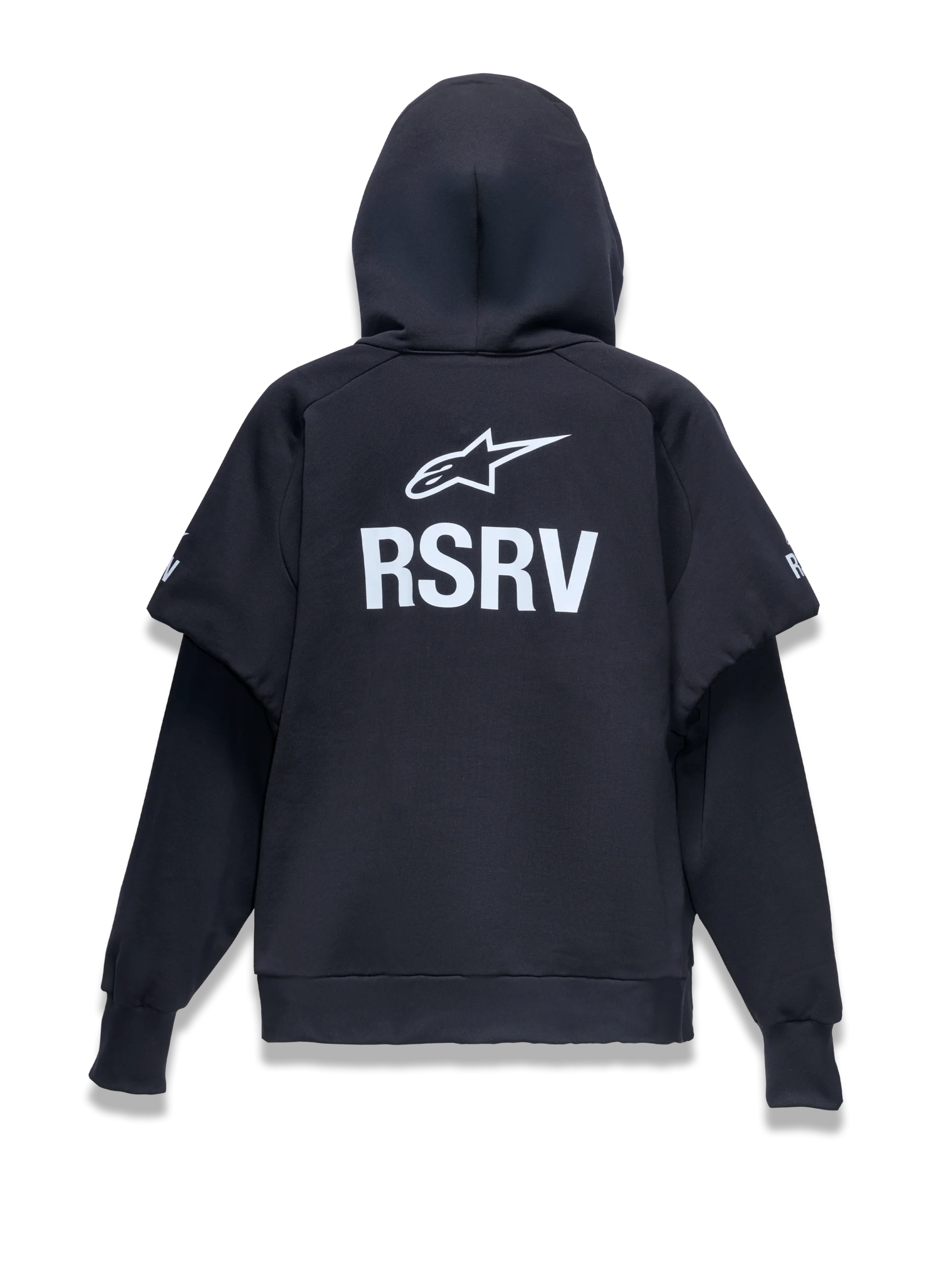 L’inspiration pour le Vault Hoodie existe autant dans le passé que dans le futur. Basé vaguement sur un exemple du début des années 2000 d’un hoodie décontracté Alpinestars, il fait sa déclaration la plus frappante au-dessus des épaules. La capuche surdimensionnée et structurée ainsi que le col haut reflètent une entreprise plus moderne de la marque Alpinestars—le casque. Des évents en maille double sont montés haut dans le col/visage de la capuche, faisant davantage référence à son langage de design semblable à un casque, tandis que la construction multi-panneaux lui donne une forme et une identité prononcées. Les manches amples sont enveloppées par des épaules surdimensionnées, et les logos RSRV et Astar de marque ornent les biceps et le dos. La base raccourcie et effilée crée un ajustement qui fait allusion aux maillots amples rentrés dans des pantalons techniques des athlètes de motocross des années 80 et 90.